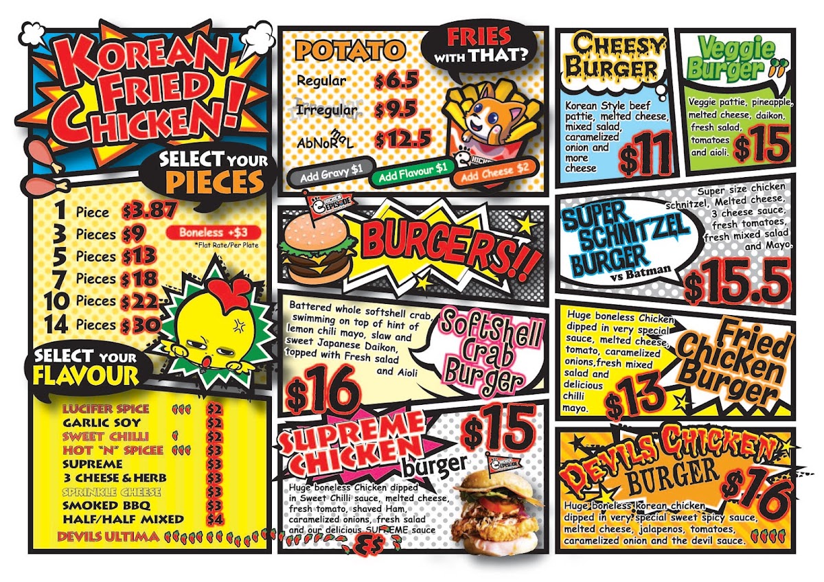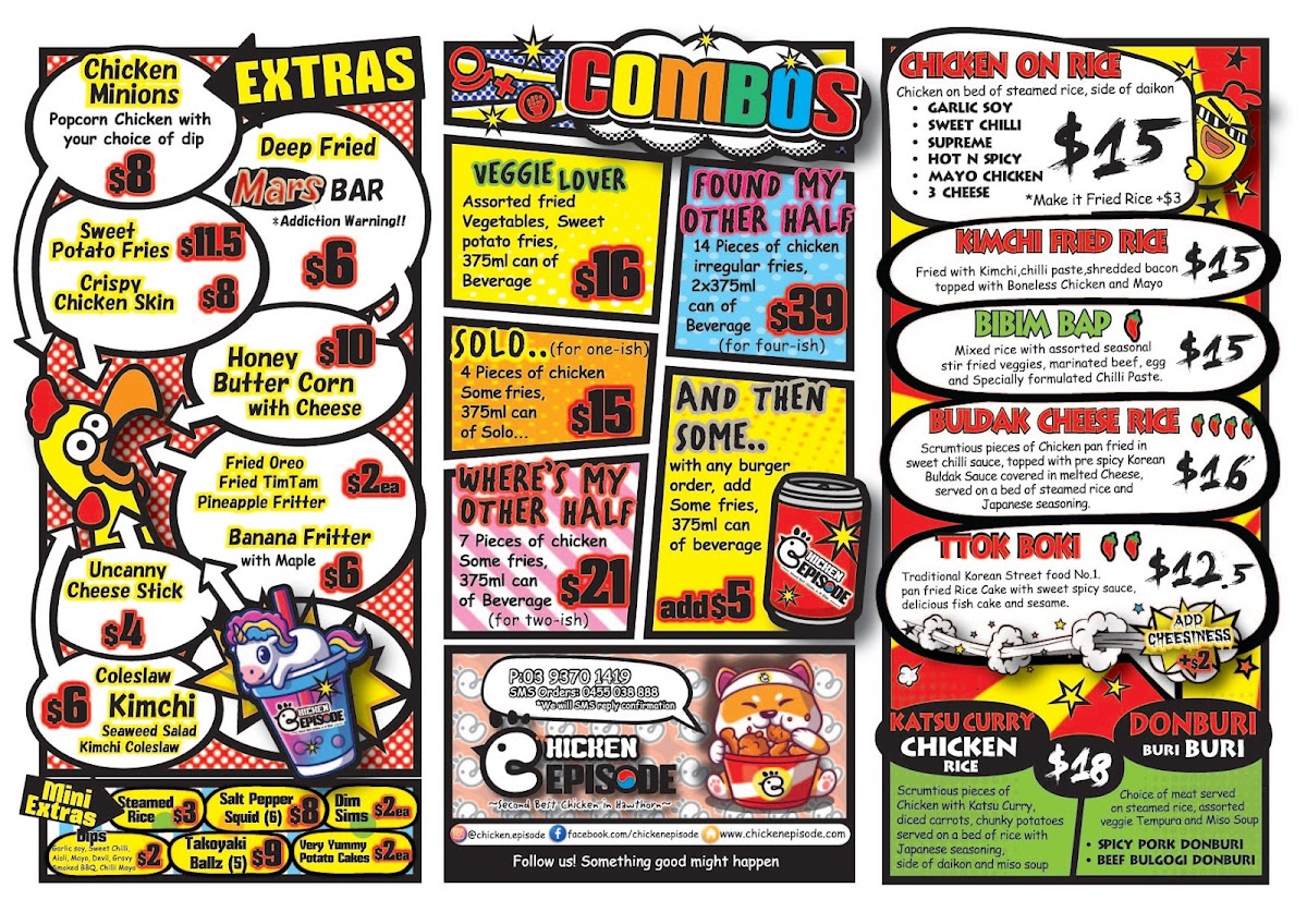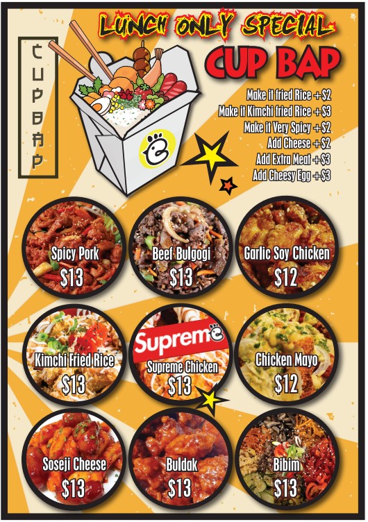 The menu at Chicken Episode in Hawthorn offers a diverse range of dishes, blending comfort food with bold flavors. For a refreshing start, you can enjoy a light Kimchi Coleslaw or Seaweed (Wakami) Salad, both perfect for an appetizer. If you're in the mood for something sweet, try one of their popular Bubble Tea options, including Taro Milk Tea and Brown Sugar Milk Tea. For those craving snacks, the Pineapple Fritters and Takoyaki are popular side choices. The restaurant also features a variety of rice dishes such as the BiBimBaB, Chicken On Kimchi Fried Rice, and the indulgent Bulldak Cheese Rice. New additions like the KATSU Curry Chicken Rice provide a delicious twist to the menu. Burger lovers can savor hearty options like the Cheesy Burger or the Supreme Chicken Burger (New). If you're after something spicy, their Korean Fried Chicken section offers bold flavors, with options like Mephisto Spice and Flakey Garlic. Complement your meal with a side of Garlic Cheese Fries or Kimchi Fries With Cheese and Bacon, which are crowd favorites. To round off the meal, beverages like Coke, Sprite, or a chilled Solo are available. For an all-in-one experience, opt for the Veggie Burger (Combo) or Super Schnitzel Burger (Combo). Whether you're after a light salad, crispy fried chicken, or indulgent sides, Chicken Episode delivers satisfying options for all tastes.